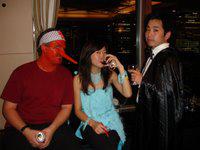 Our costumes, mine the silliest. Sachi is the one drinking, and Etsuro is on the far right |