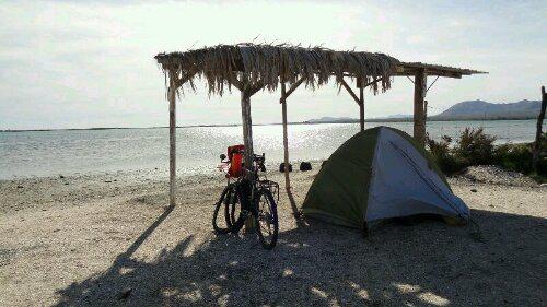 Sta. Rosalia was nothing special. I packed up my bike and rode through the tiny town, but didn't find anything to hold my interest (I came back later to find the real town is up in the hills, and worth a visit, though it doesn't have much of tourist interest other than a prefab church built by Eiffel). I found a campsite early in the day, south about 10 miles from SR. There are two sites right next to each other separated by a flimsy fence. I wandered through one: a small city of RVs, the beachside already claimed by snow birds. I decided to try the other where there was a single RV. The owner of the RV came out, thinking I was looking for another cyclist who had come in the night before. He was a nice guy, the beach front was open, and it was just a bit cheaper, so I decided to stay.