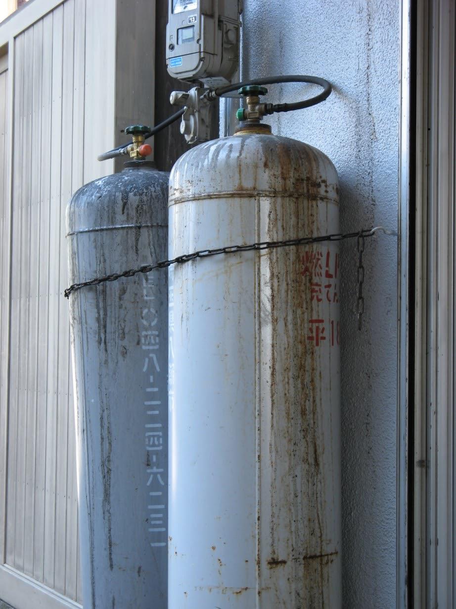 That is an explosion waiting to happen; but now that I've been made aware of it, I've noticed these tanks are everywhere. I guess maybe that tiny chain strung across the two tanks will be enough to stabilize them in case of a localized earthquake. Let's hope so.