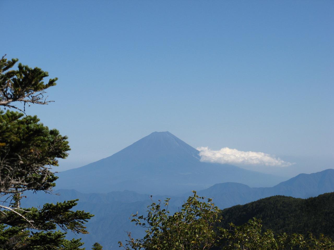It was a clear day, one of the clearest I have experienced in the Japanese mountains. The mountains I was climbing were fairly high, too, and as I reached their peaks the vegetation fell off, until, at the peaks, there was little more than scrub and very tiny trees. So there were many inspiring views along the way, of Shiramine Sanzan (Kita-dake's group) to the west, Kaikoma-ga-take to the north, and Yatsu-ga-take, the mountains of Okuchichibu, and Fuji to the east. It was intoxicating to be in such fabulous company, and I felt a joy and sense of ease the entire time I was winding through Ho'o Sanzan that I just do not normally experience.