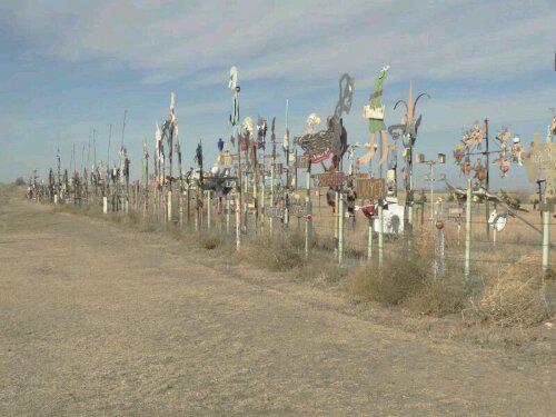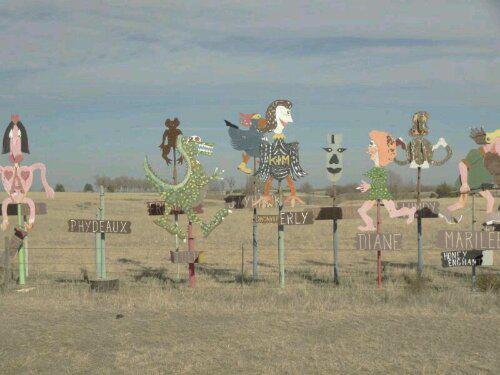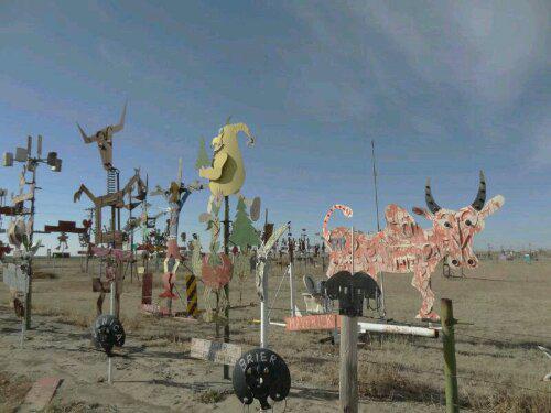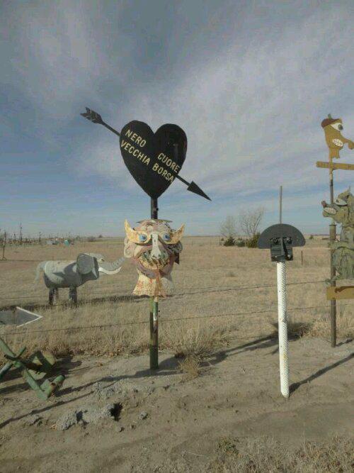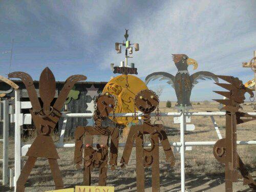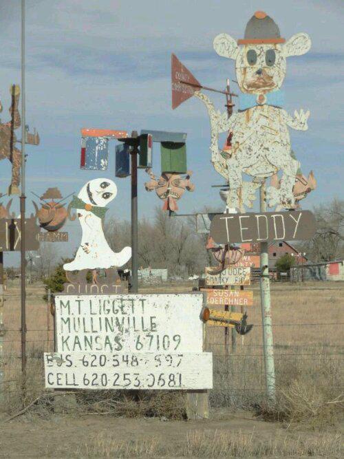 I stopped off in Mullinville at my friend Billy's suggestion. The highway on the west side of town is lined with MT Ligget's crazy sculptures. I ran into him leaving to go the post office, said he'd be right back. When he didn't show up after 10 minutes, I chose biscuits and gravy over conversation.
